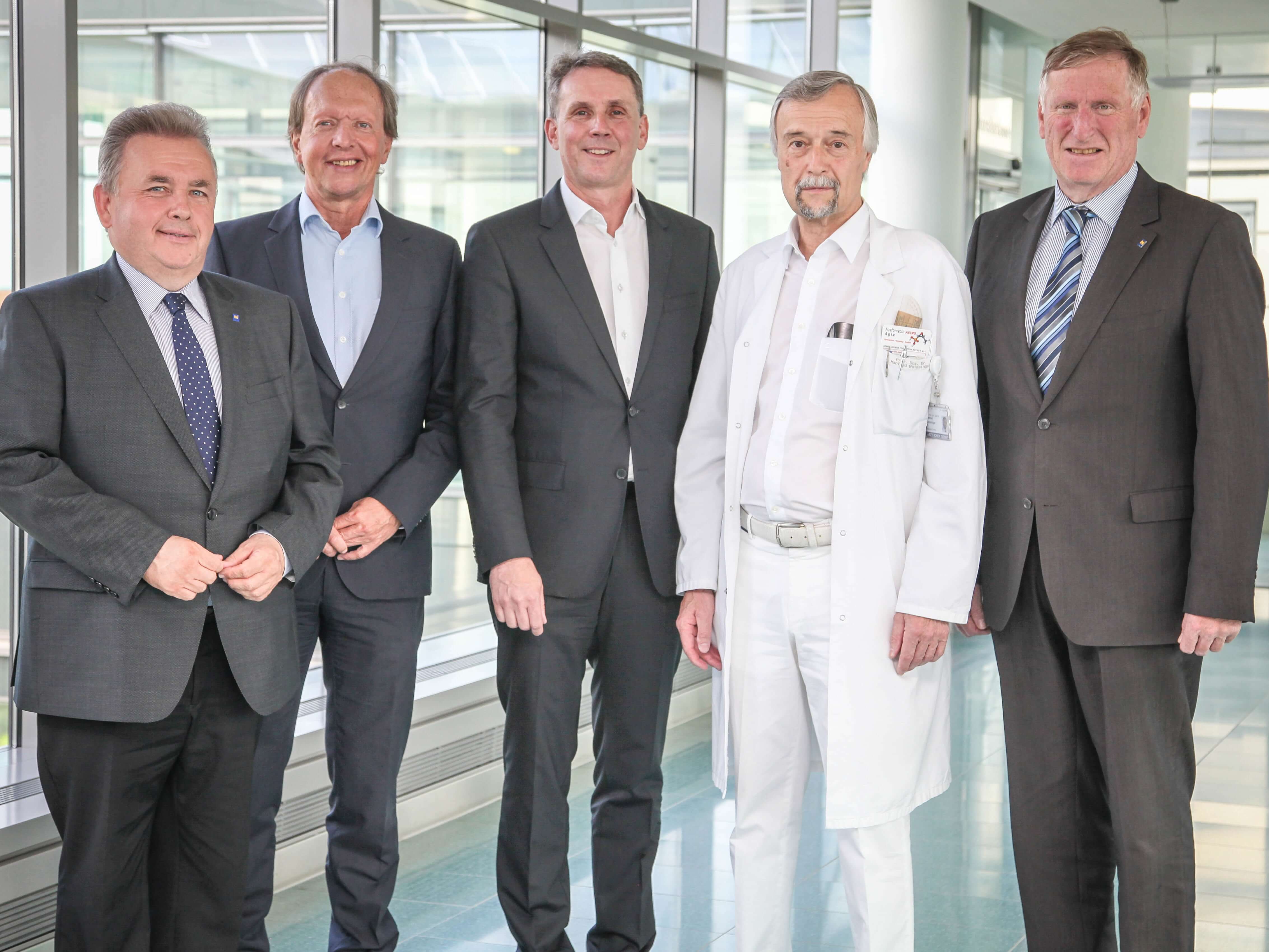 Begrüßung des neuen Abteilungsvorstandes: v.l.: Abgeordneter zum NÖ Landtag Franz Mold, Regionalmanager Dr. Andreas Reifschneider, Prim. Dr. Karl Miedler, MBA, Prim. Prof. Univ. Doz. Dr. Manfred Weissinger, Bürgermeister Herbert Prinz.
