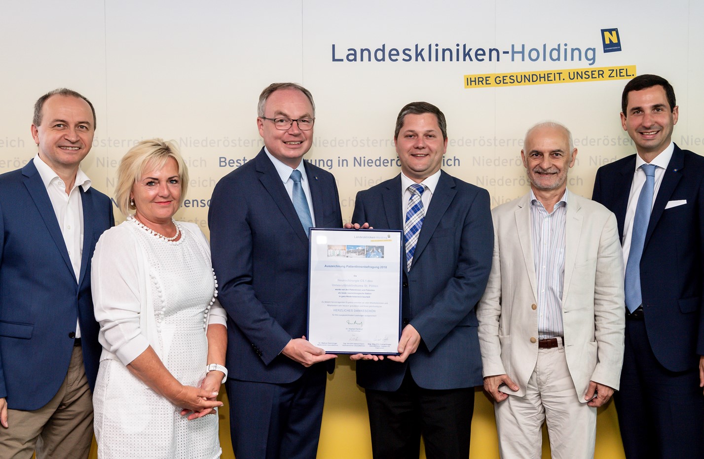 Mag. Mag. (FH) Konrad Kogler (Geschäftsführer Personal und Organisation der NÖ Landeskliniken-Holding), Christa Peya, MSc (Bereichsleitung am Universitätsklinikum St. Pölten), LH-Stellvertreter Dr. Stephan Pernkopf, SL DGKP Karl Kolm, BSc, Prim. Univ.-Prof. Dr. Karl Ungersböck (beide Klinische Abteilung für Neurochirurgie), Mag. Dr. Bernhard Kadlec (Kaufmännischer Direktor am Universitätsklinikum St. Pölten)